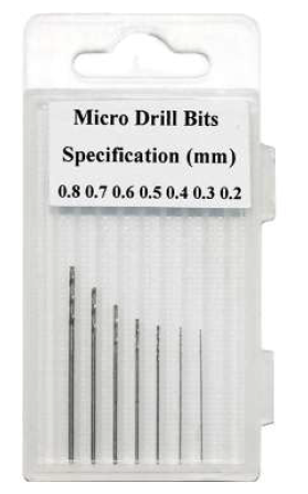 Wiertła w komplecie: 0.1mm, 0.2mm, 0.3mm, 0,4mm, 0.5mm, 0.6mm, 0.7mm, 0.8mm.