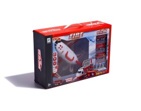 Pożar? Wypadek? Z tymi zadaniami poradzą sobie dzielni strażacy wyposażeni w ciężki sprzęt. Na miejsce akcji dotrą… drogą powietrzną! Duży samolot, który na swoim pokładzie może przetransportować dołączone do zestawu auta i znaki. Samolot, jak prawdziwy transporter ciężkiego sprzętu, posiada opuszczaną rampę przy ogonie, która umożliwia wjazd pojazdów. Może być również wykorzystana do zrzutu wody nad płonącym terenem (nie zalecamy moczenia zabawki - woda może uszkodzić elementy odpowiedzialne za dźwięki i światełka)! Samolot otwierany jest również z boku, by móc łatwiej manewrować zabawkami wewnątrz. Nie zapominajmy jednak o walecznych strażakach! Dla nich przygotowano tradycyjne wejście po schodkach. Zapnijcie pasy, ruszamy do walki z żywiołem!