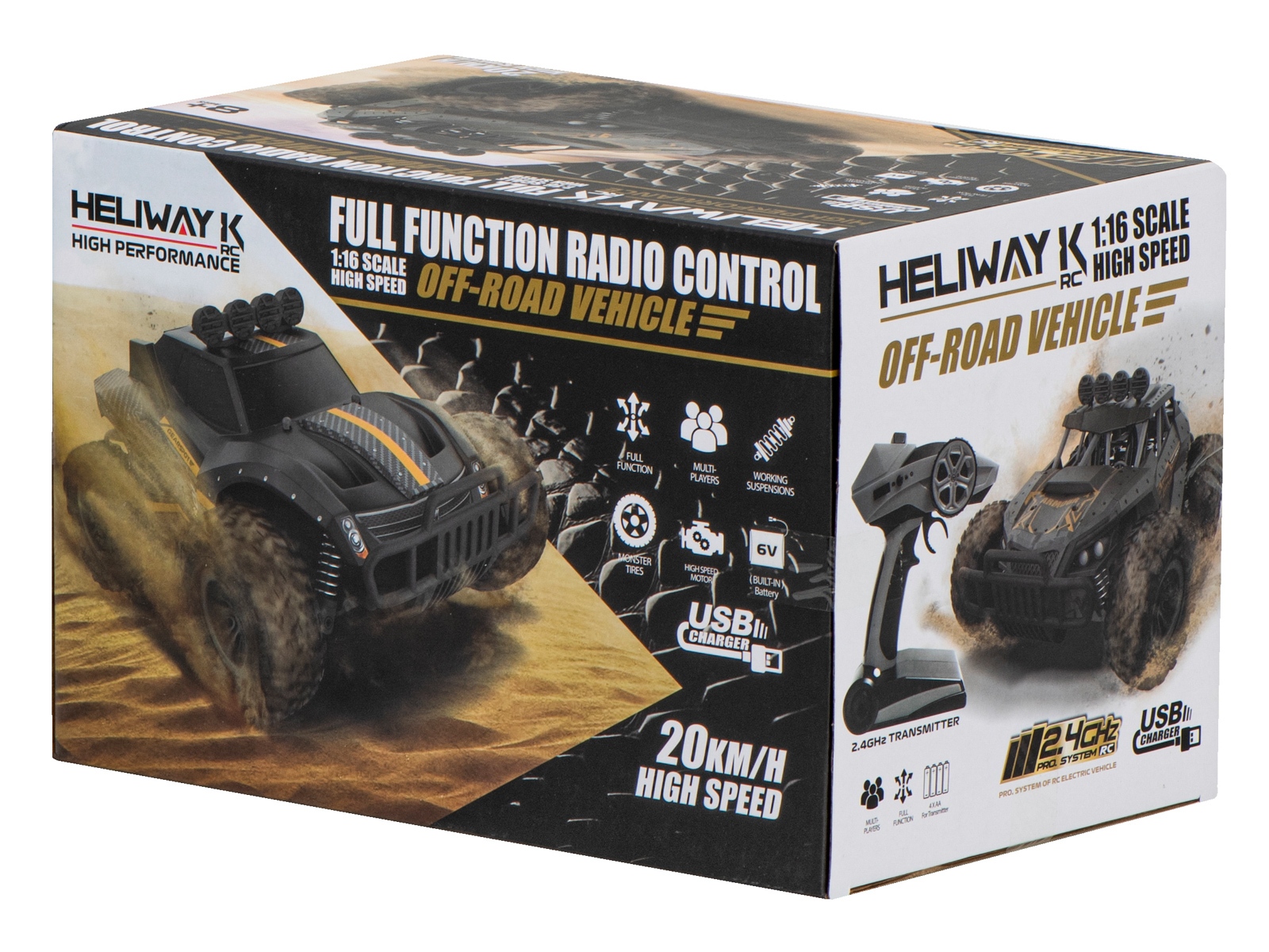 Jazda w ciężkich warunkach wymaga sprzętu, który zniesie trudy każdej podróży. Poznaj pojazd gotowy na ekstremalne trasy. Auto terenowe, które docenią wszyscy miłośnicy modeli zdanie sterowanych. Intuicyjny pilot "pistolet" nie będzie problemem dla amatorów, zaś doświadczonym użytkownikom zapewni gładką, przyjemną jazdę. To nie jest "zabawka", który szybko się znudzi, a to za sprawą prędkości, którą rozwija. Pędzi nawet 20 km/h! Auto jest niezwykle zwrotne, pilot reaguje na każdą sugestię - razem tworzą zestaw, który pozwoli Ci wygrać każdy wyścig off-road'owy. Pojazd porusza się na 4 dużych gumowych kołach (średnica 7,5cm) z bieżnikiem, gwarantujących przyczepność. Auto wyposażono w dźwięk cofania, dodający całej zabawie realizmu.