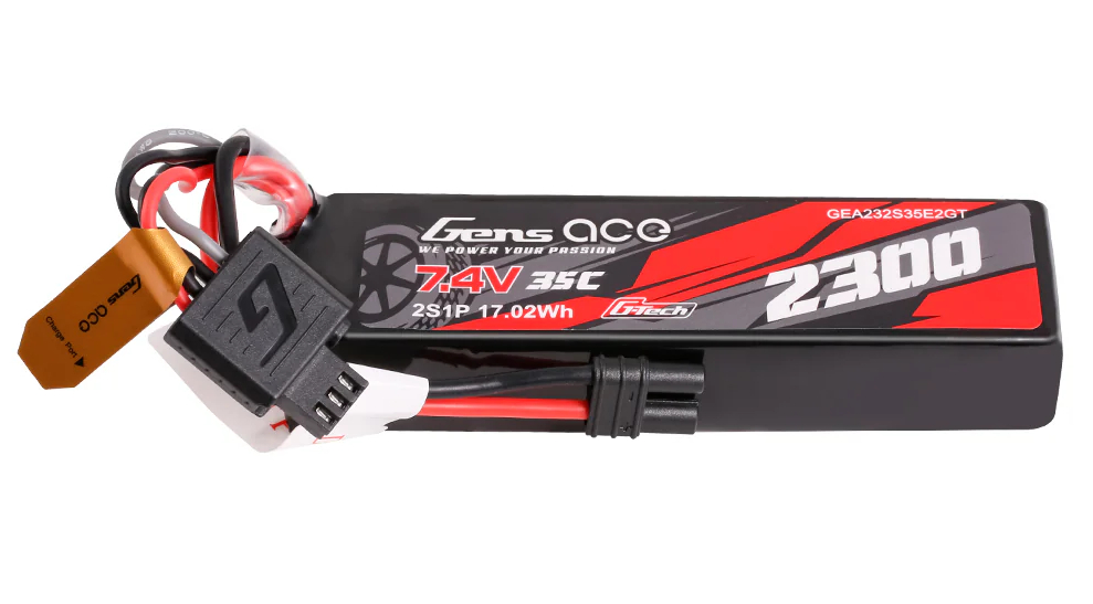 Akumulator LiPo Gens Ace 2300mAh 7,4V 35C 2S1P z opatentowaną wtyczką iEC2 został zaprojektowany specjalnie do modeli Arrma Grom Series, Losi NASCAR i innych pojazdów w skali miniaturowej.