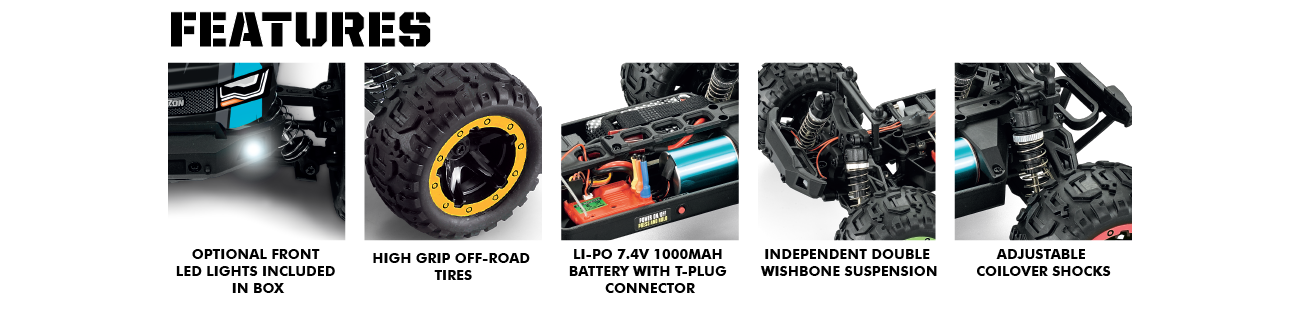 Pierwszą rzeczą, którą każdy kierowca RC chce osiągnąć swoim nowym zestawem, jest szybka jazda! Naciśnięcie spustu gazu na nadajniku 2,4 GHz Cię nie zawiedzie, a do tego jest dziecinnie proste! Sterowanie jest łatwe do opanowania dla każdego.