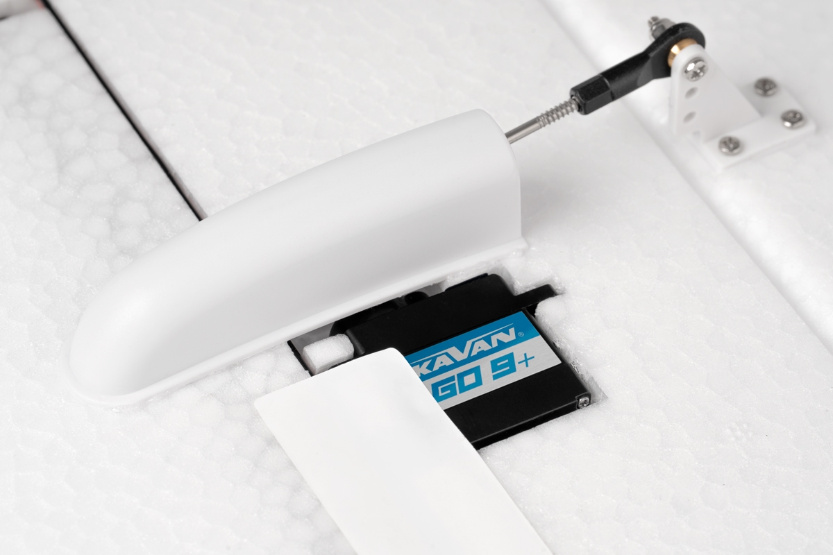 Przygotowanie do pierwszego lotu jest banalnie proste: zamontuj i zabezpiecz statecznik poziomy i pionowy dwiema śrubami, połącz uchwyty skrzydeł i zabezpiecz je dwiema śrubami, podłącz serwomechanizmy i regulator do odbiornika, podłącz pakiet lotniczy – to wszystko!