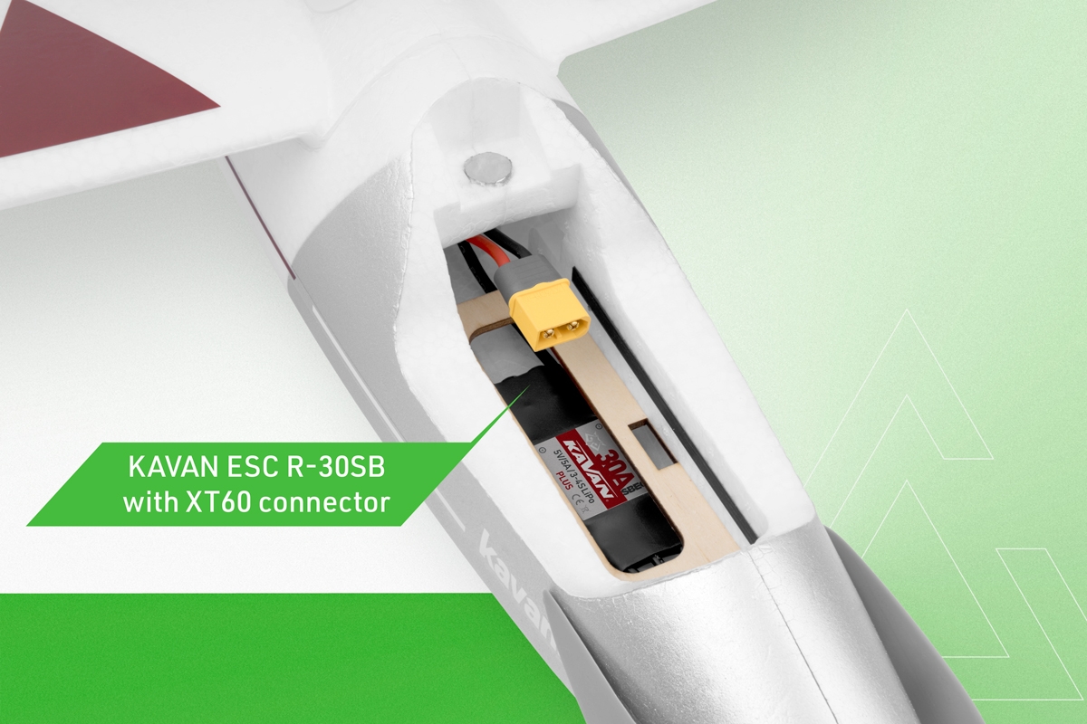 Kadłub z pianki EPO jest wyposażony w silnik bezszczotkowy C2217-1200, regulator KAVAN R-30B Plus (z rozszerzonymi możliwościami programowania) oraz serwomechanizmy steru wysokości i steru kierunku. Zdejmowana osłona kabiny jest zabezpieczona blokadą magnetyczną. Składane śmigło o wymiarach 8,5×6 cali (21,7 x 15,7 cm) wykorzystuje standardowe łopaty o wymiarach 8×6 cali (zwiększona średnica całkowita wynika z zastosowania dłuższego jarzma). Wloty powietrza chłodzącego po obu stronach dziobu zapewniają przyjemne chłodzenie silnika, regulatora i akumulatora; wylot powietrza znajduje się na spodzie kadłuba. Dwuczęściowe skrzydło EPO z węglowymi dźwigarami głównymi jest dostarczane z dwoma serwomechanizmami lotek i zamontowanym mechanizmem ich łączenia. Usterzenie EPO jest odłączane i mocowane dwiema śrubami. Ster wysokości i kierunku są sterowane za pomocą pary popychaczy.